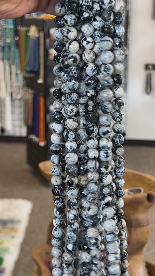 10mm Faceted Black and Cream Fire Agate.15” Strand. Approximate 38 bead on a strand.