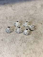 12mm Tibetan Style Bead Caps. These caps are available in two tones: Plated Silver and Plated Gold. Sold 6 per set. Lead and nickel free.
