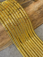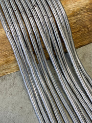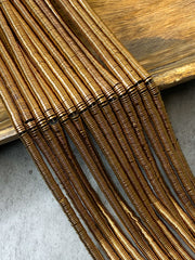 6mm Smooth Metallic Hematite Heishi beads. Available in five finishes: Bright Gold, Bright Silver, Light Gold, Gunmetal, and Bronze. 15" Strand