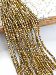 This 6x6mm Faceted Cube Hematite boasts a shimmering sparkle in shades of gunmetal, gold, and silver. With its faceted surface, this hematite adds a touch of elegance to any jewelry piece or craft project. Enhance your designs with this versatile and eye-catching gemstone.
