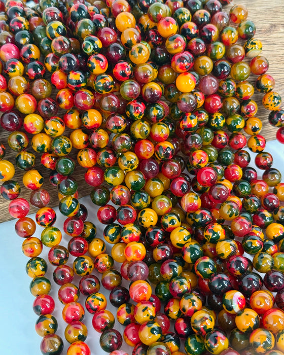 Add vibrant color and natural beauty to your DIY jewelry projects with our 10mm smooth multicolor agate gemstone beads. Each bead features a unique blend of red, green, and yellow hues, making every piece one-of-a-kind. These high-quality semi-precious stone beads come on a 15-inch strand with approximately 38 round beads, each with a 1mm hole, ideal for stringing on most jewelry wires or elastic cords.